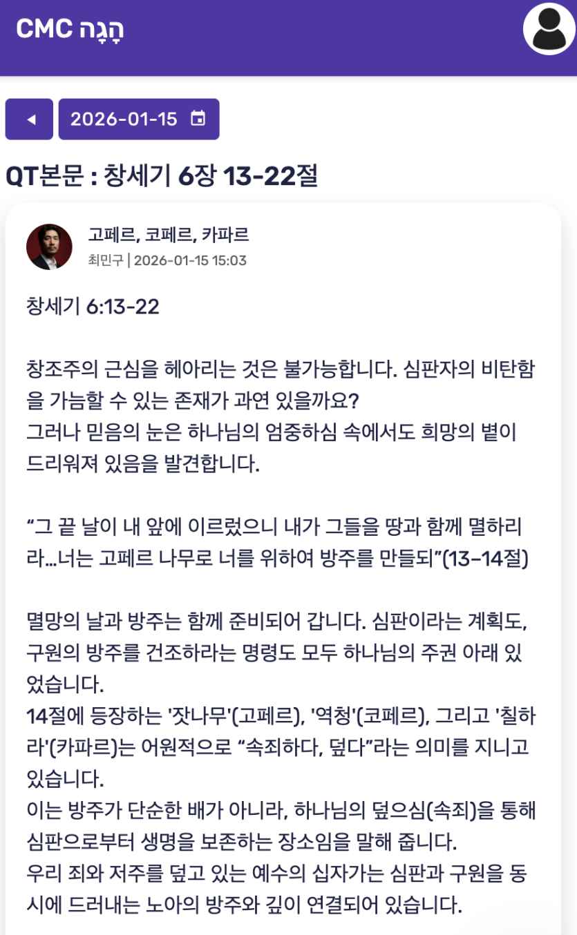 2. 매일 하나님의 말씀을 묵상하는 '하가'를 제공하여 말씀을 읊조리고 묵상하며 일상에서 하나님의 말씀 안으로 정렬되도록 합니다.